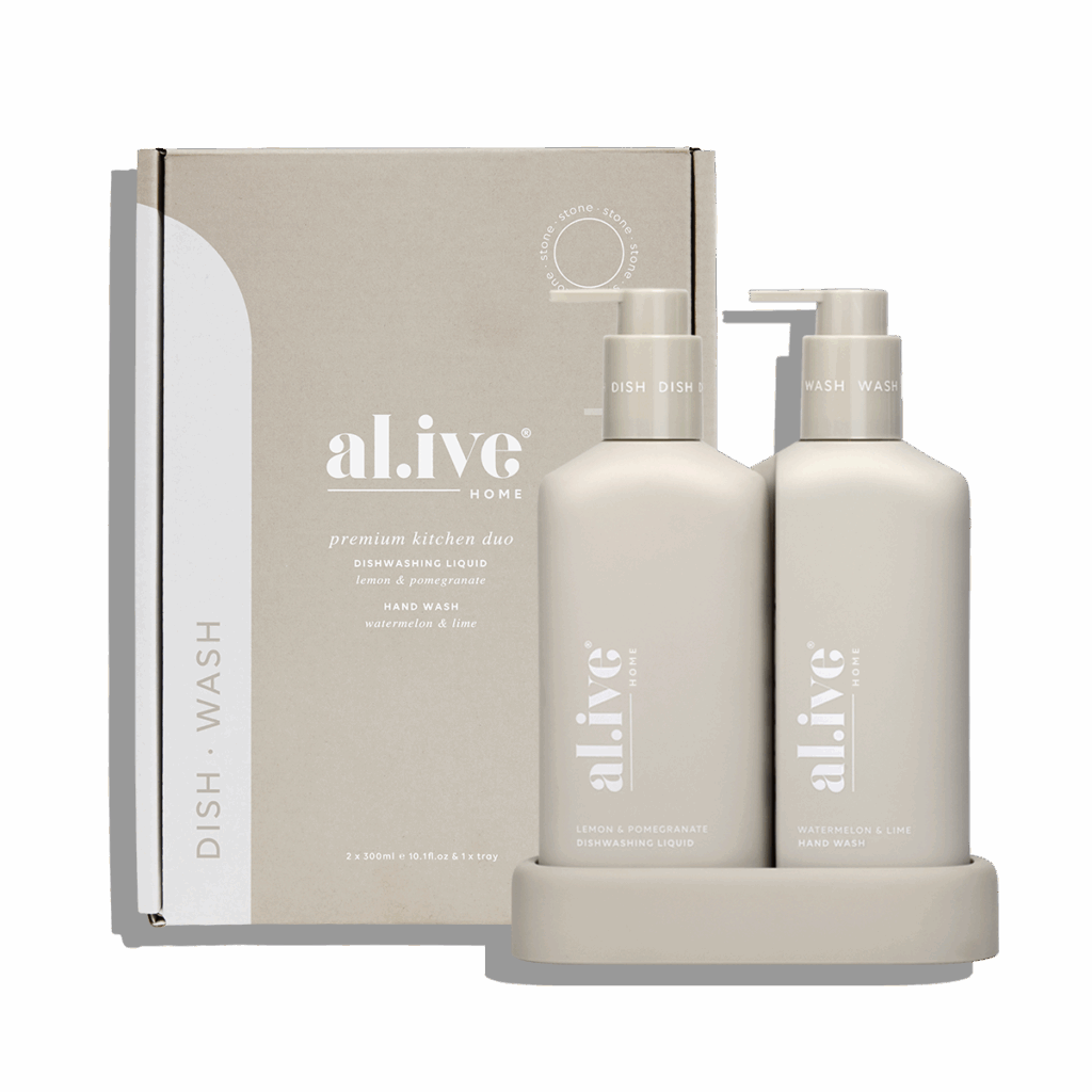 The al.ive body Hand Wash & Dishwashing Liquid Premium Kitchen Duo is a beautiful yet practical product, elegantly packaged to elevate your countertop. This Duo includes a 300ml Lemon & Pomegranate Dishwashing Liquid, a 300ml Watermelon & Lime Hand Wash and a matching custom tray.
