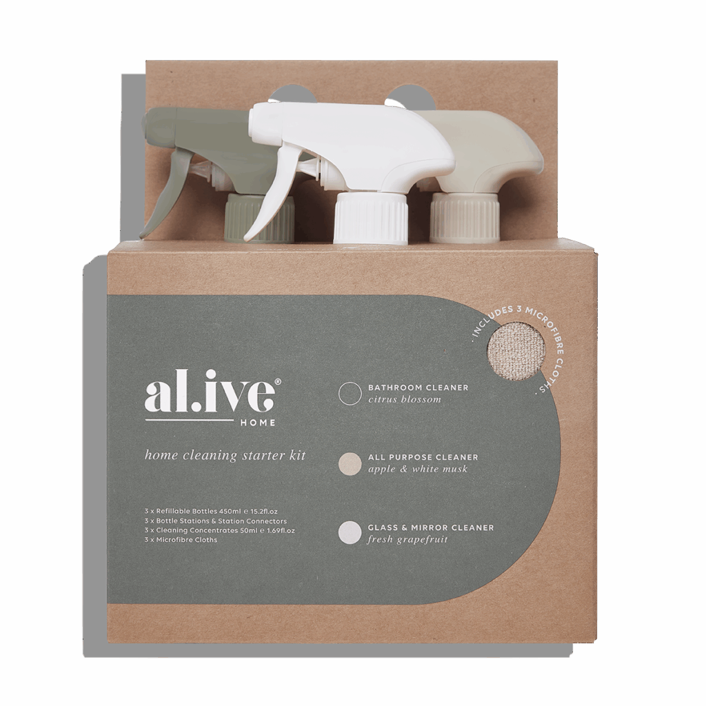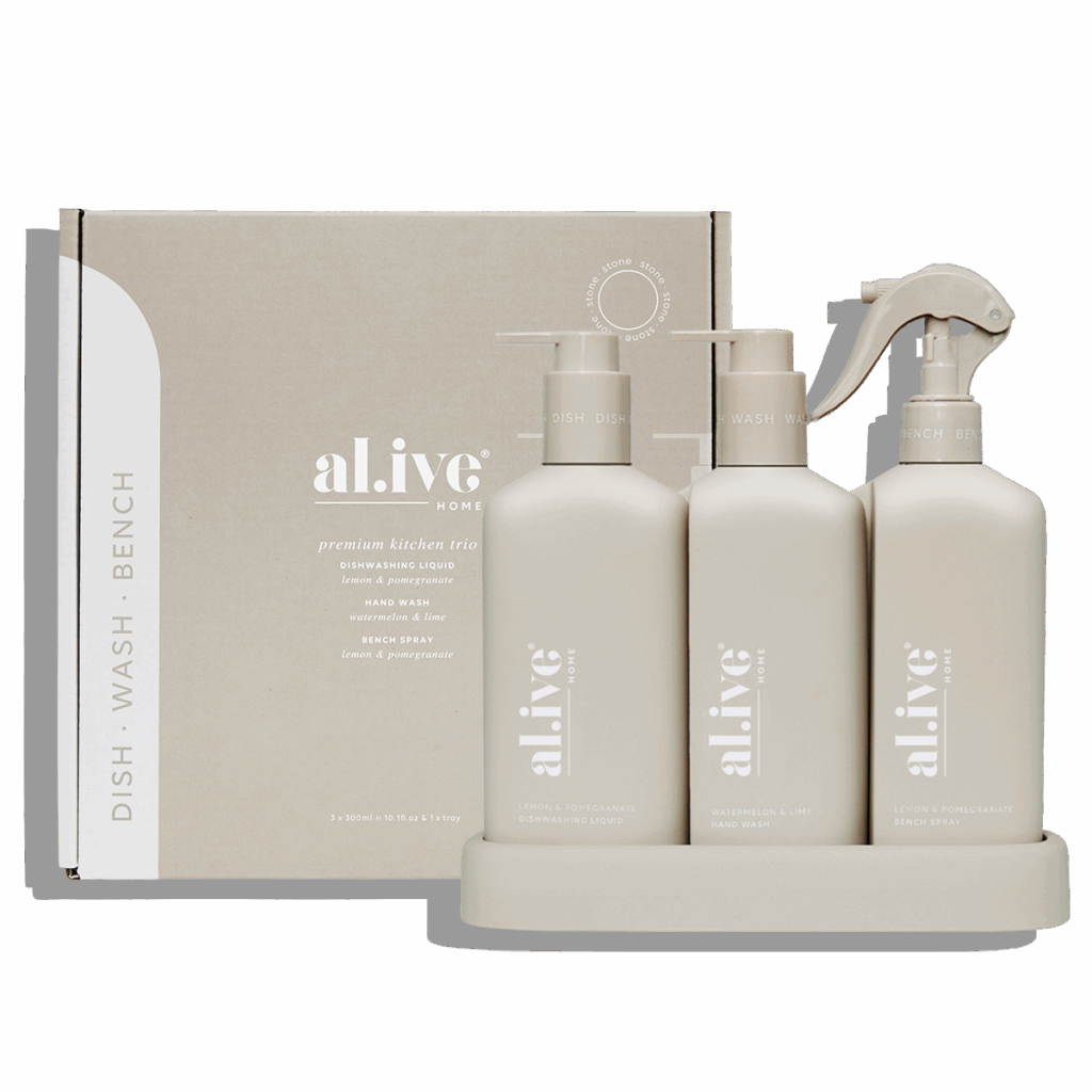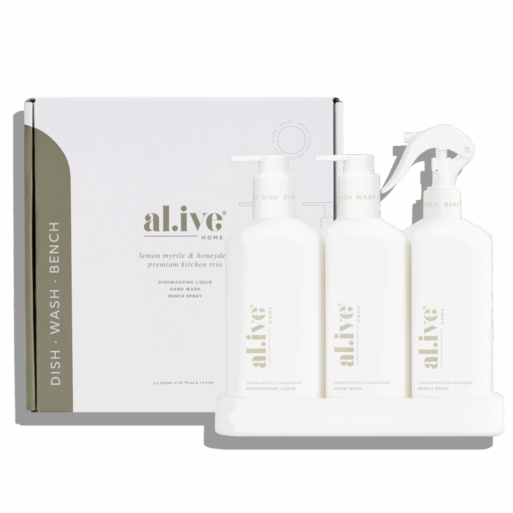Introducing the al.ive body Kitchen Trio – the ultimate solution for your kitchen cleaning needs. This set includes our Dishwashing Liquid, Bench Spray, and Hand Wash, all conveniently nestled within a beautifully designed custom tray.
