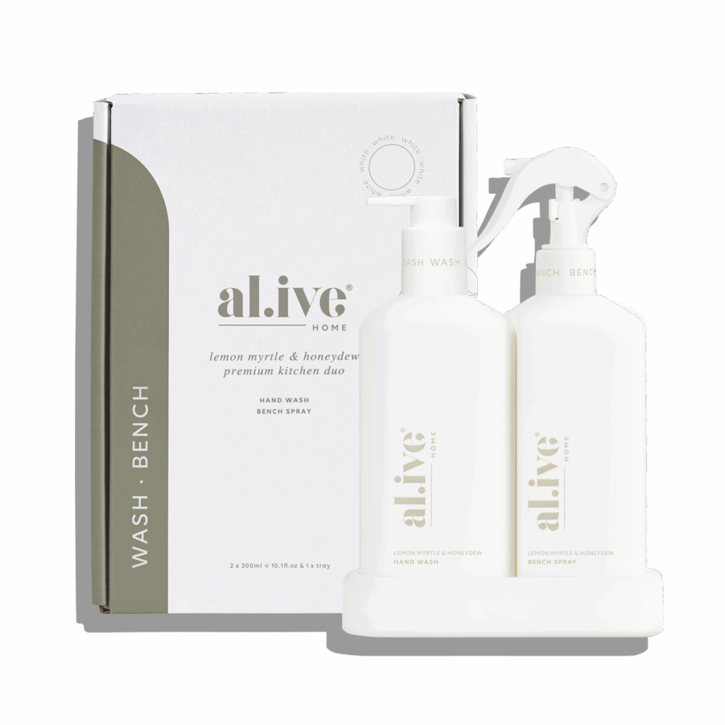 The al.ive body Hand Wash cleanses and pampers your hands with natural botanical extracts, leaving your hands smooth and soft. the Bench Spray is perfect for cleaning countertops, stovetops and other surfaces, filing your kitchen with fresh crisp Lemon and Honeydew notes.