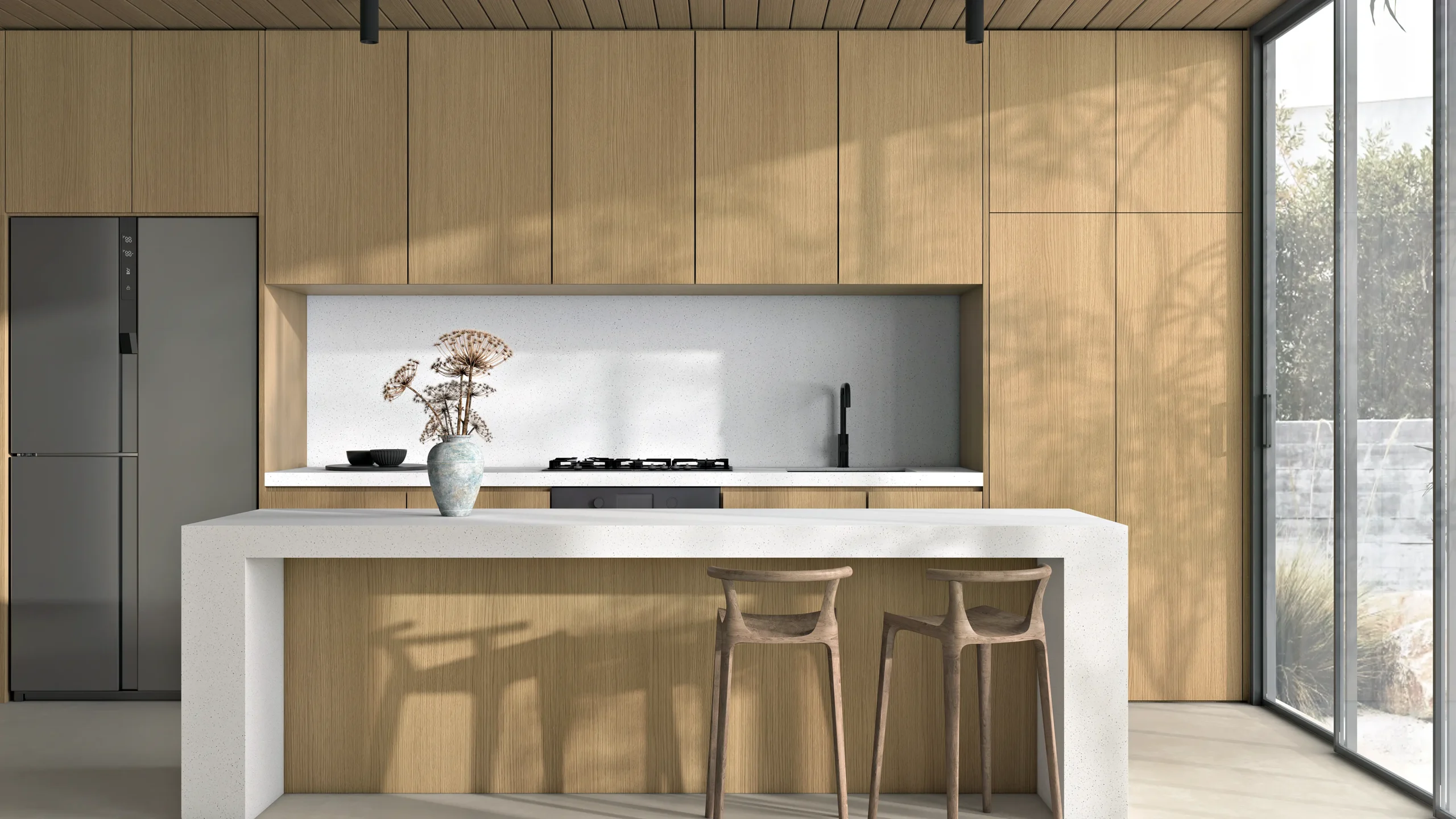 A bright white base and subtle grain detailing make Mero an easy to design with stone surface design perfect for any budget.
