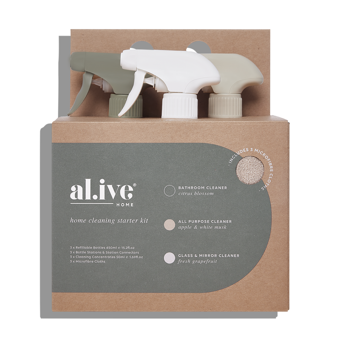 al.ive Home Cleaning Starter Kit$99.00 (inc. GST) al.ive home Cleaning Starter Kit - al.ive Home Cleaning Starter Kit quantity + Add to cart SKU: SKU67900 Category: al.ive Description Description Introducing the al.ive home Cleaning Starter Kit, the perfect solution for anyone looking for a convenient, effective and eco-friendly cleaning system. This kit includes everything you need to get started on your cleaning journey: three refillable bottles, each pairing with a 50ml cleaning concentrate for All Purpose, Bathroom, and Glass & Mirror cleaning, as well as three companion microfibre cloths and three bottle stations with connectors that allow you to customise your cleaning station to suit your needs. These powerful cleaners have been expertly formulated to tackle the toughest cleaning jobs. Simply pour the 50ml Cleaning Concentrates into the coinciding Refillable Bottle, fill up to the 450ml line with regular tap water and give the bottle a good shake. The unique Station and Connector system is exclusive to our range and ensures your cleaning products have a designated home to return to. The Stations hold each bottle securely while the Connectors let you customise the setup into an angled-line or pyramid format. Keep your cleaning products organised, easy to find, and always at your fingertips. al.ive Home Cleaning Concentrate Refills are eco-friendly, using 90% less plastic than a standard cleaning product, made from 30% post-consumer recycled plastic and are 100% recyclable. Invest in the al.ive Home Cleaning Collection and experience the power of design-inspired, customisable and eco-friendly cleaning for yourself. Includes: 3 x Refillable Bottles 450ml 3 x Bottle Stations & Station Connectors 3 x Cleaning Concentrates 50ml 3 x Microfibre Cloths The 450ml bottles are designed for longevity and to be refilled using our al.ive Home Cleaning Concentrate Refills. Additional information Additional information Weight 0.9 kg Dimensions 16 × 13.5 × 19 cm Related products al.ive Kitchen Trio- Lemon Myrtle & Honeydew $96.00 (inc. GST) Add To Cart al.ive Wash and Lotion Duo- Sea Cotton & Coconut $89.00 (inc. GST) Add To Cart al.ive Wash and Lotion Duo- Apricot & Sweet Fig $89.00 (inc. GST) Add To Cart al.ive Kitchen Duo – Lemon Myrtle & Honeydew $66.00 (inc. GST) Add To Cart