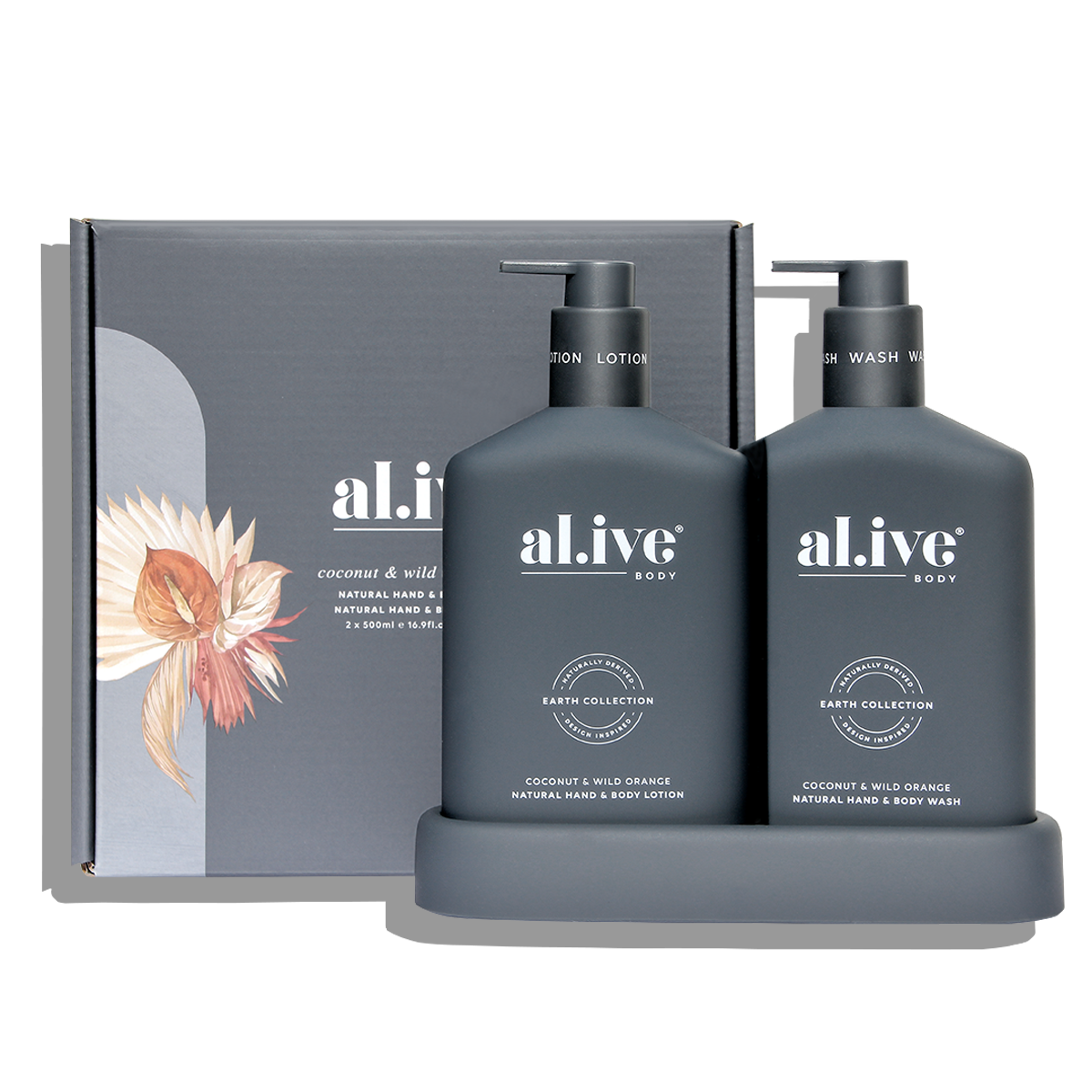 al.ive Wash and Lotion Duo- Coconut & Wild Orange$89.00 (inc. GST) al.ive body Wash & Lotion Duo in Coconut & Wild Orange - al.ive Wash and Lotion Duo- Coconut & Wild Orange quantity + Add to cart SKU: SKU67896 Category: al.ive Description Description The al.ive body Wash & Lotion Duo in Coconut & Wild Orange contains a luxurious blend of naturally derived ingredients, fortified with essential oils and native botanical extracts. This set includes a 500ml Hand & Body Wash, 500ml Hand & Body Lotion and a matching tray With its charcoal-blue tone and matte finish, it brings a grounded sophistication to your bathroom or kitchen. The al.ive body Australian made hand & body range combines product purity with designer aesthetics to stimulate your senses and shape your surroundings. Additional information Additional information Weight 1.3 kg Dimensions 21.5 × 7.5 × 21.5 cm Related products al.ive Wash and Lotion Duo- Green Pepper & Lotus $89.00 (inc. GST) Add To Cart al.ive Kitchen Duo – Lemon Myrtle & Honeydew $66.00 (inc. GST) Add To Cart al.ive Wash and Lotion Duo- Apricot & Sweet Fig $89.00 (inc. GST) Add To Cart al.ive Home Cleaning Starter Kit $99.00 (inc. GST) Add To Cart